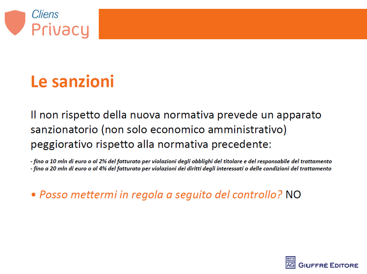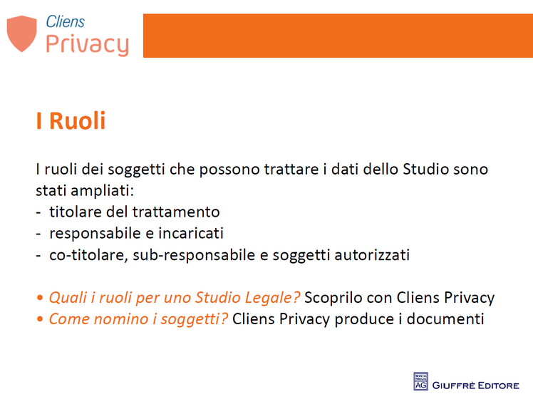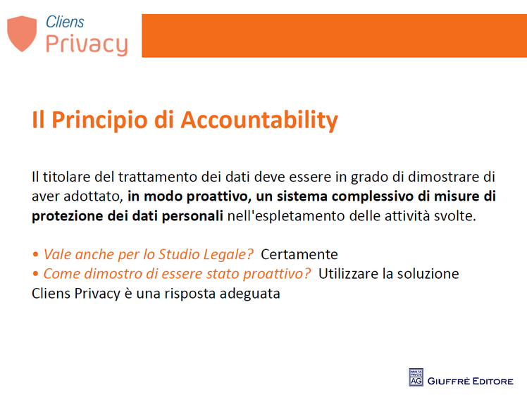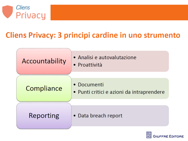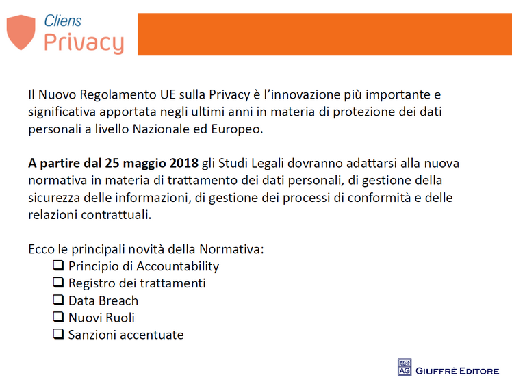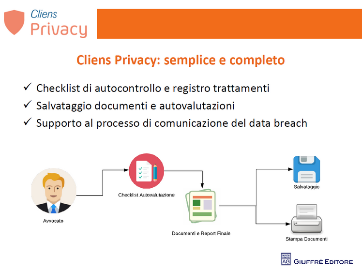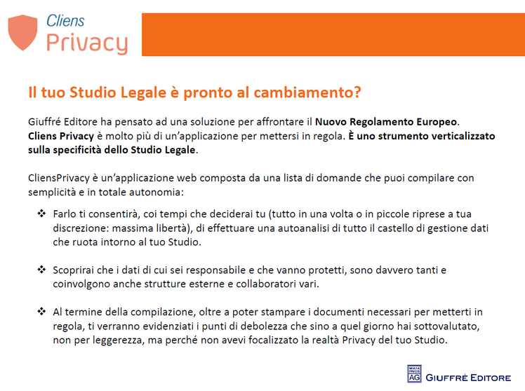 Cliens Privacy è il software Giuffrè che ti permette di verificare in modo semplice e sicuro il livello di adeguamento del tuo studio legale alla normativa europea in materia di privacy (GDPR).